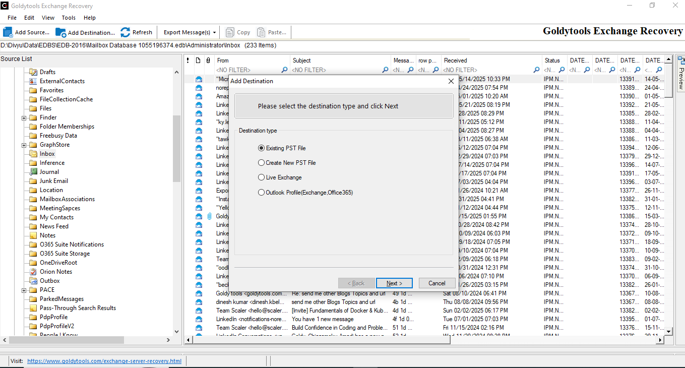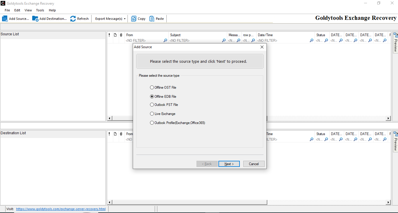 Goldytools Exchange recovery tool provides multiple platforms to add as a source. Just open the tool and select source from any of these options: