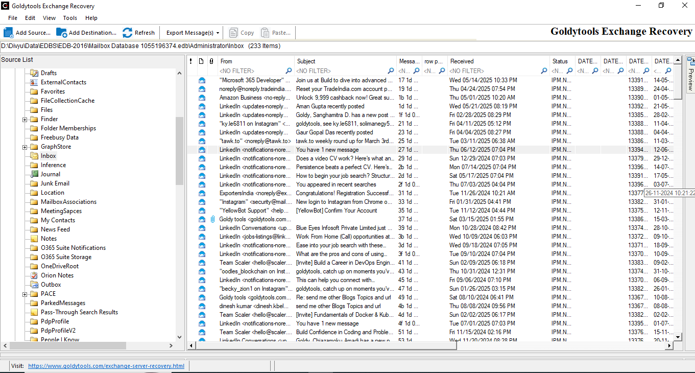 Run the Goldytools Exchange Server Recovery tool to restore complete email messages, calendars, contacts, tasks, to-do lists, notes, etc. from damaged or dismounted EDB files. It ensures a hassle-free process with complete accuracy and precision.